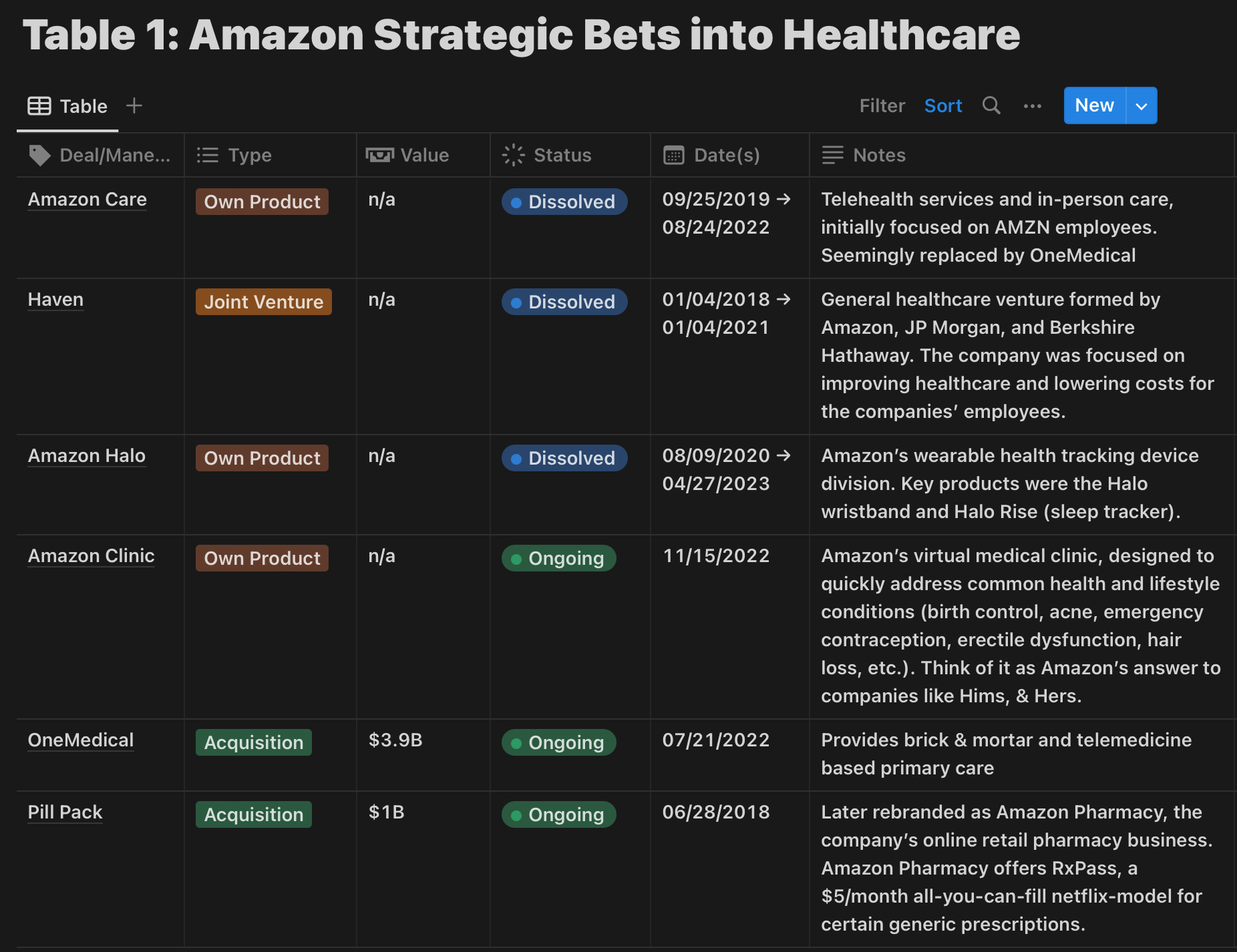 Amazon is a, or rather the, major player in the retail and e-commerce sector, however the company has historically targeted Healthcare as a major growth area. Over the last several years, Amazon has acquired or launched new business units aimed at capturing different aspects of the healthcare value chain. They’ve made major bets in telehealth, primary care, pharmacy, insurance, and health tech. The success and failure of these strategic bets has been mixed, but this pattern of corporate behavior clearly indicates a deep interest in leveraging the company’s core competencies to disrupt multiple aspects of the healthcare value chain. Table 1 below highlights some of Amazon’s major bets in more detail.