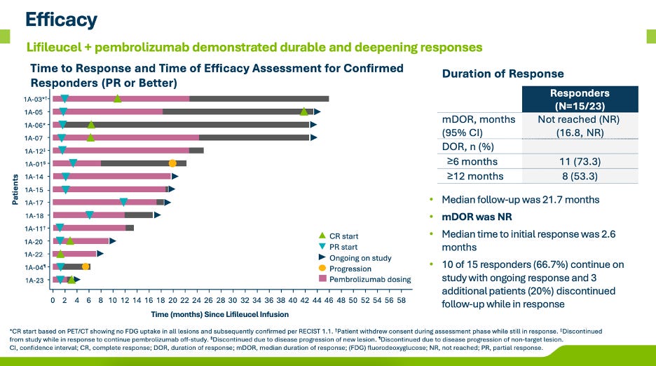 Replimune, who I’ve discussed before, also presented very interesting potentially pivotal data that could cause Iovance and AMTAGVI some trouble, specifically in the 2L+ melanoma setting. RP1 + nivolumab registered a ~34% ORR in 2L+ melanoma with mDOR not reached at >35 months and importantly showed responses both in injected and un-injected lesions. This is key, as the primary negative stigma surrounding the oncolytic viruses has largely been the inability to trigger systemic responses from local treatment (i.e. the abscopal effect). The company has plans to initiate a confirmatory randomized P3 study before BLA submission in patients who have failed PD-1+CTLA-4 or at least PD-1 if they are not candidates for CTLA-4. Notably, this post PD-1+CTLA-4 patient population is again an approximation of the ideal TIL patient. In a world where off the shelf RP1 + nivo is approved, I can envision community docs wanting to try this combination ahead of referring their patients to an ATC for TIL therapy, potentially shrinking the total addressable market for AMTAGVI in the 2L+ melanoma setting.