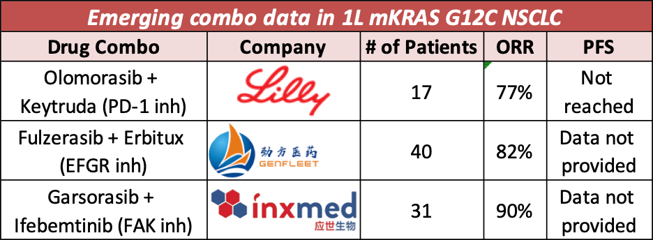 Lilly, Genfleet, and Inxmed presented three different types of combinations with their own KRAS G12C inhibitors, showcasing very high ORRs in early data, ranging from 77-90%. This new wave of KRAS G12C inhibitors, with iterative chemical improvements over the first-gen versions (LUMAKRAS and KRAZATI) that seem to be translating into efficacy improvements. Similar combo data of LUMAKRAS and KRAZATI in 1L NSCLC in combo with PD-1 have shown responses in the ~50-60% range. Lilly’s purchase of Loxo continues to look better over time and perhaps they could supplant Amgen and BMS as a late comer to this KRAS G12C arena. Notably, olomorasib is in a larger P3 study in combo with PD-1+chemo in 1L NSCLC.