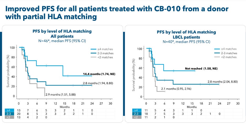 The crux of the new data they shared at ASCO highlighted a correlation between HLA-matching and efficacy. Specifically, those patients who had a match of at least 4 HLA-alleles (i.e. partial-matches) seemed to show a PFS benefit compared to subgroups with lower levels of HLA matching. The 4+ HLA matched subgroup showed a mPFS of 14.4 months with a CR rate of 46%. If you just look at the LBCL patients who were 4+ (n=11) the ORR was 91% (36% CR) with 6-month PFS of 53%. For reference, YESCARTA in ZUMA-7 registered an ORR of 83% (65% CR), mPFS of 14.7 months, and 4-year PFS rate of 42%.