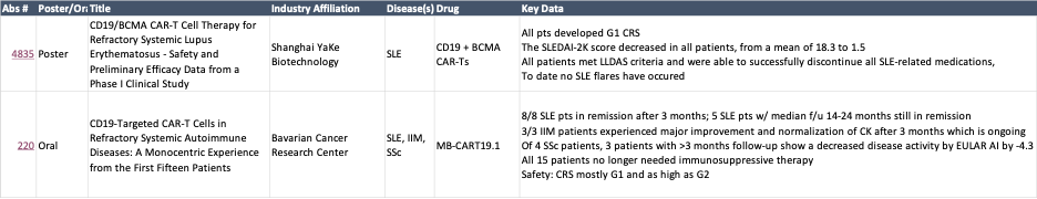 Both abstracts above (#4835 and #220) will have readthrough to each player looking to develop CD19 based programs in this space. Both data sets highlighted remission of systemic lupus (SLE) and independence from anti-inflammatory medications after treatment and follow-up. Data from the German study (#220) show 5 SLE patients with a minimum of 14 months follow-up still in remission. It’s clear to me that CD19 based B-cell depletion is demonstrating immense benefit for treatment refractory autoimmune patients. The question becomes how sticky are these responses long-term? Will patients need to keep going back to get new cells manufactured and dosed? Will they need to resume some level of anti-inflammatory medicine later? These are the near-term question I’m hoping to get more clarity on as these data sets mature. Longer term I’m curious about differential response across disease types (i.e., is SLE easier to treat than RA or sclerosis?) and how will payers manage cost in a world where autologous CD19 CAR-T are approved for the same indications that drugs like Remicade and Humira once dominated? I’d love to see how auto’ CD19 CAR-T stack up vs. CD19 bispecifics or Allo’ CD19 CAR-T in these diseases. If B-cell depletion is really what is driving benefit here, you might not need an autologous product to get to the same therapeutic goal – an off-the-shelf product, like a bsAb, that would not require chemo pre-conditioning could do the job just fine and be more palatable to the insurer and PBM rebate and reimbursement spider web that controls access to medications in these markets in the US.