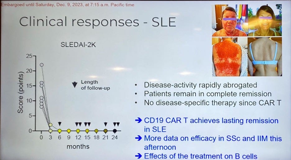 At least on BioTwitter, these update data seemed to be the main headliner of ASH. We knew from the abstract that 15/15 patients with lupus, myositis, or systemic sclerosis received CD19 CAR-T and remain in remission without need for additional immunosuppressive therapy at a median follow-up of 15 months. That’s impressive on its own. What we didn’t get to see were the photos of just how powerful CD19 CAR-T therapy is in this disease group (see image below):
