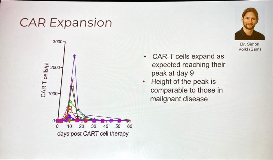 So, what does this mean for the biotech players developing therapies in this space? Clearly auto CAR-T players like Cabaletta and Kyverna feel as though their lead programs, basically doing the same thing, are more de-risked. However, I think the folks who are really smiling are the allo CD19 CAR-T and bispecific CD19xCD3 antibody companies. If you can get extremely durable remissions in heavily pre-treated refractory patients all with cells that only persist for 20 days (and peak at 10 days), such as this German data showed, perhaps you don’t need an autologous CAR-T at all? A much more cheaply and easily manufactured allo’ CAR-T could potentially persist for long enough needed to generate the same benefit, without the patient needing to wait 2.5-3 weeks to get their cells delivered.