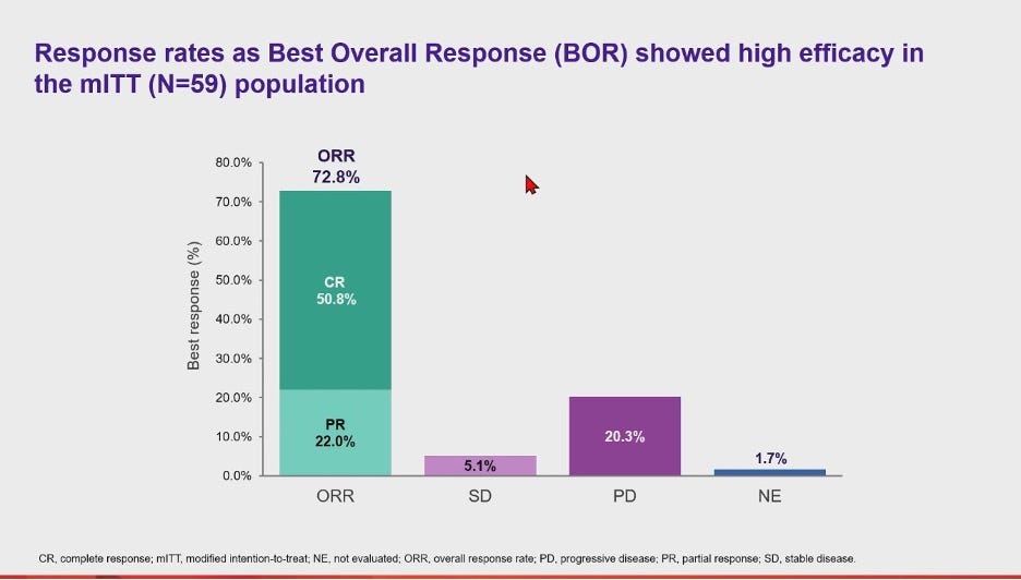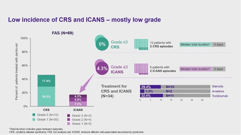 In the interim P2 data readout, Zamto-cel demonstrated an efficacy profile in line with YESCARTA’s, but with lower incidences of CRS and ICANS. Two-targets are maybe showing to better than one, with the median PFS registering at 9 months (vs. ~6 months in YESCARTA’s ZUMA-1), but it is still too early to tell whether the additional targeting is leading to an efficacy advantage.
