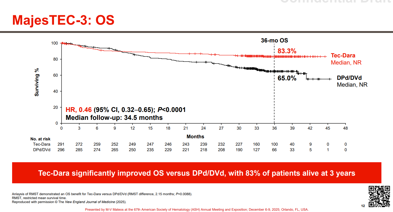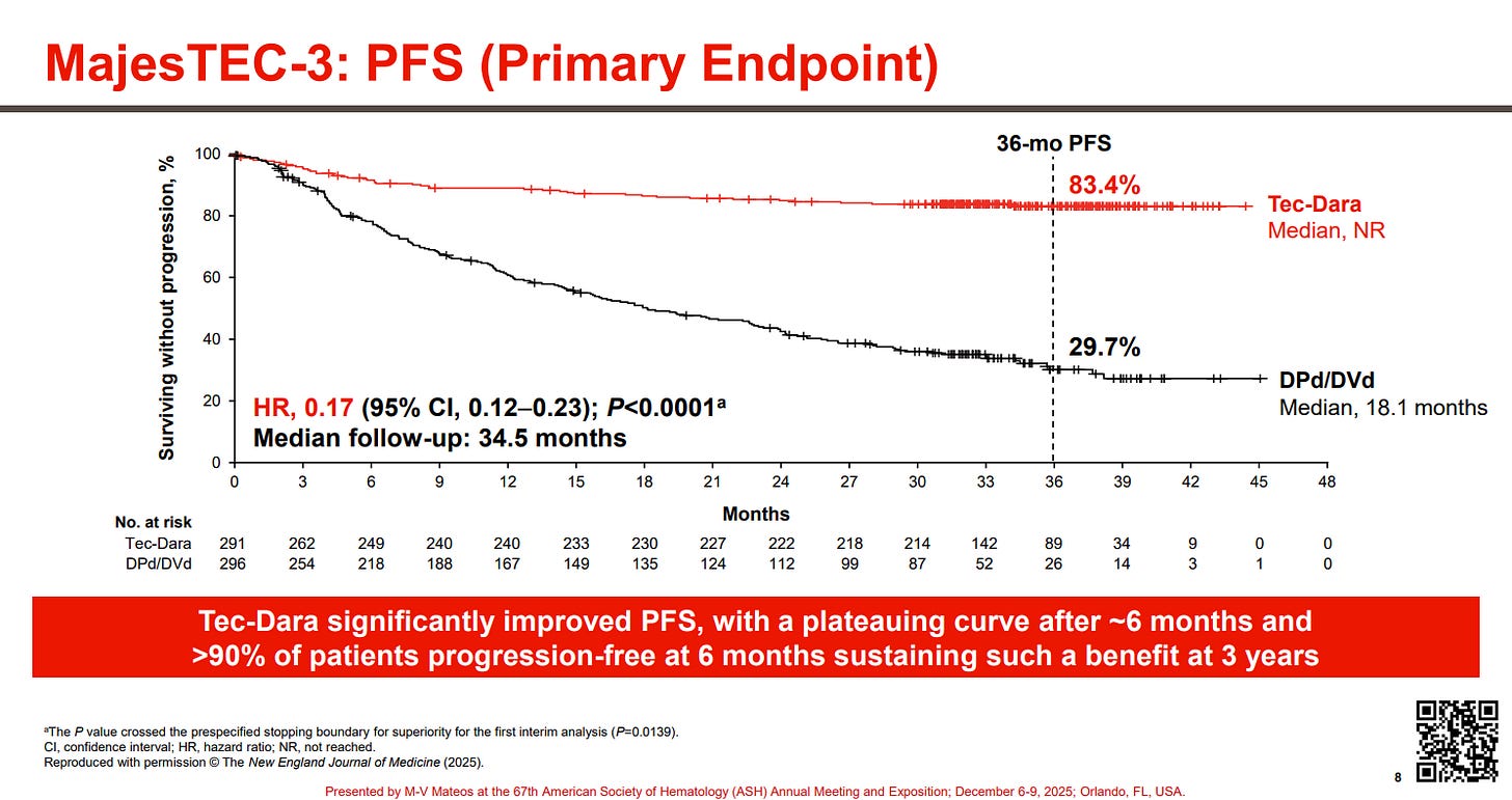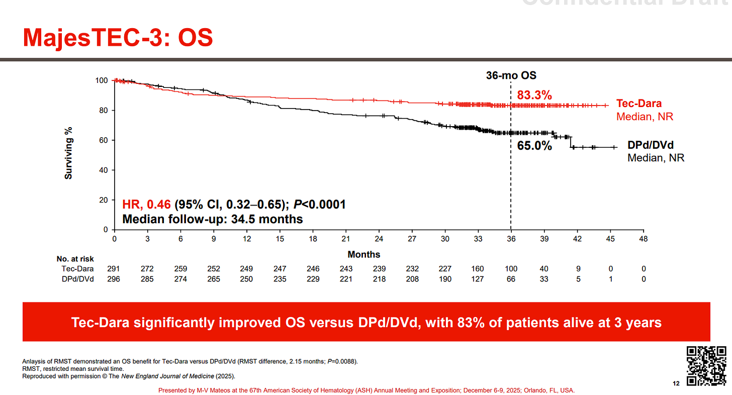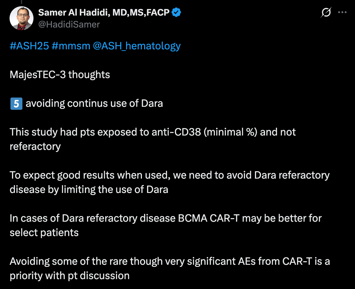 Depending on whether you are transplant-eligible or ineligible in the frontline setting, you may get a different DARA-based regimen, with some requiring continuous treatment or maintenance, and others being a fixed treatment duration too. Perhaps the power of MajesTEC-03 will also influence how DARA is used in 1L - shifting to more fixed treatment duration to avoid DARA-refractory disease.