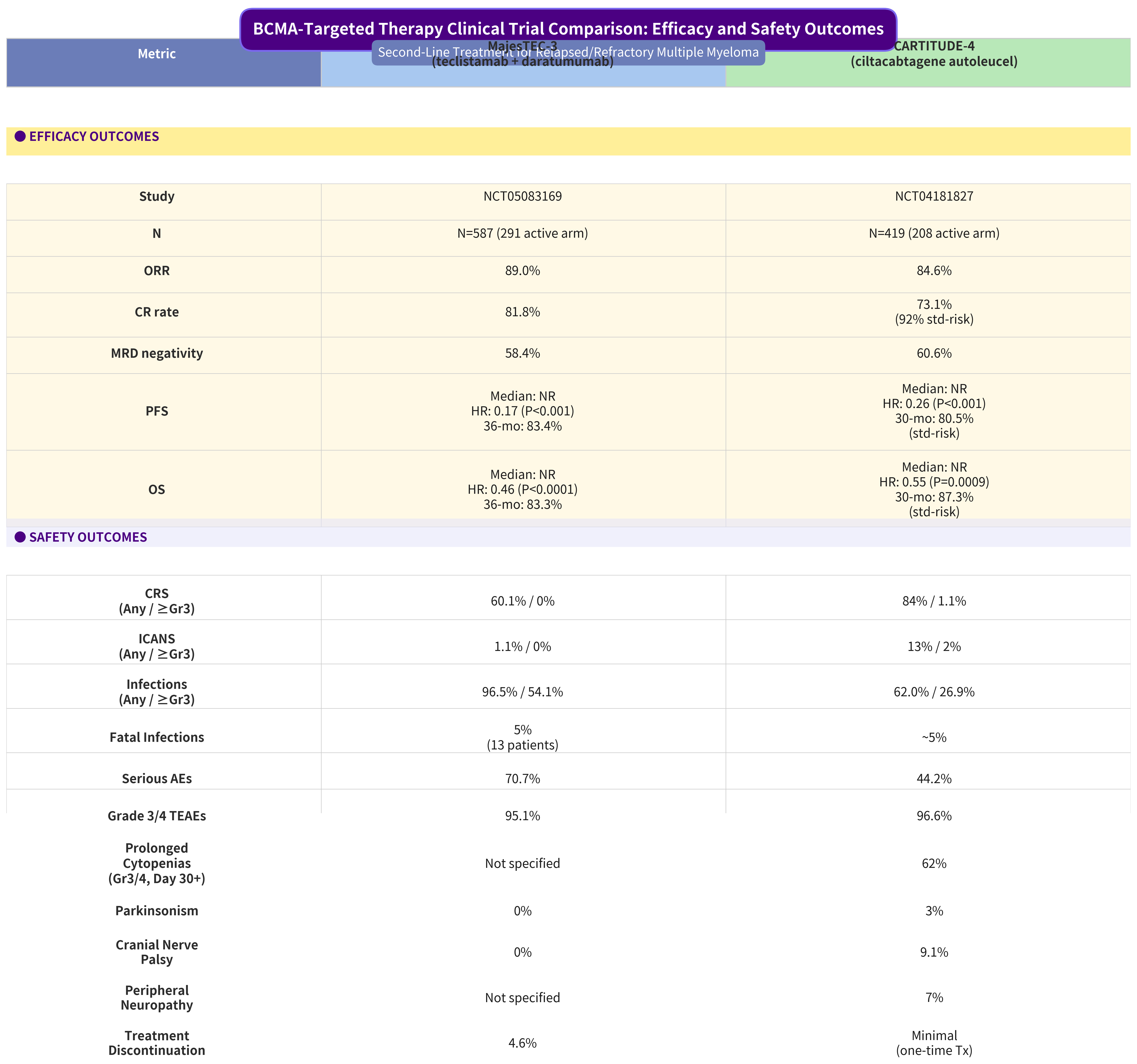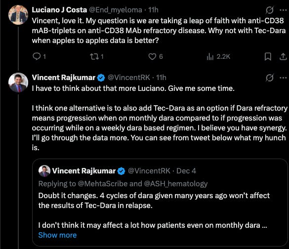 If you want to read the prevailing view as to why BCMA CAR-T is still better than this combo, you should check out Arcellx’s ASH 2025 investor event deck. The first section does a nice job laying out the CAR-T bull thesis in 2L+ MM in detail, but the broad strokes go a little something like this: