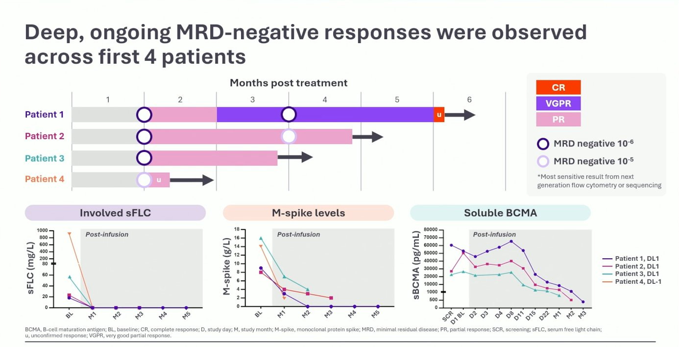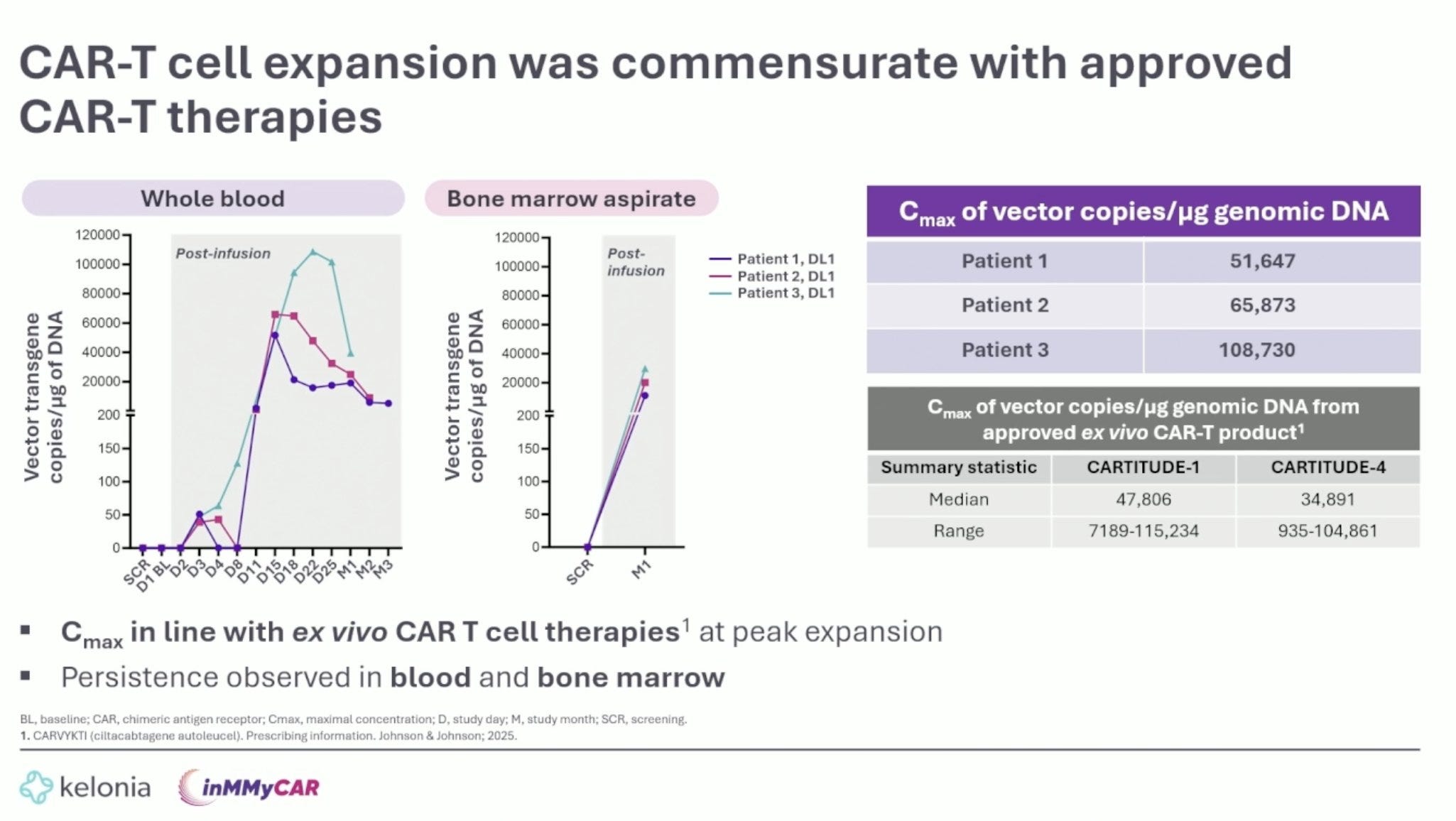 Look, it is still early days with in vivo CAR-Ts, but these results (at lower dose levels) are certainly encouraging. As more patients get treated, it will be important to see how many responses can convert to CRs. Kinetically, it was good to see Cmax being in line with CARVYKTI, suggesting that this product may have enough horsepower to generate persistent responses.