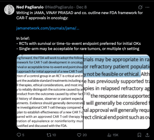 During ASH, we got word that Vinay Prasad, the controversial CBER director, delivered some revised guidance on what he would like to see for CAR-T studies moving forward in JAMA. The tweet above from Ned Pagliarulo does a nice jobs summarizing the key points. Prasad wants to see RCTs with survival endpoints for earlier line settings. Single-arm studies could still be ok for late-line therapy or rare diseases. He also wants to see superiority studies against current CAR-Ts, and is perhaps only situationally interested in equivalence or non-inferiority vs. auto CAR-Ts.
