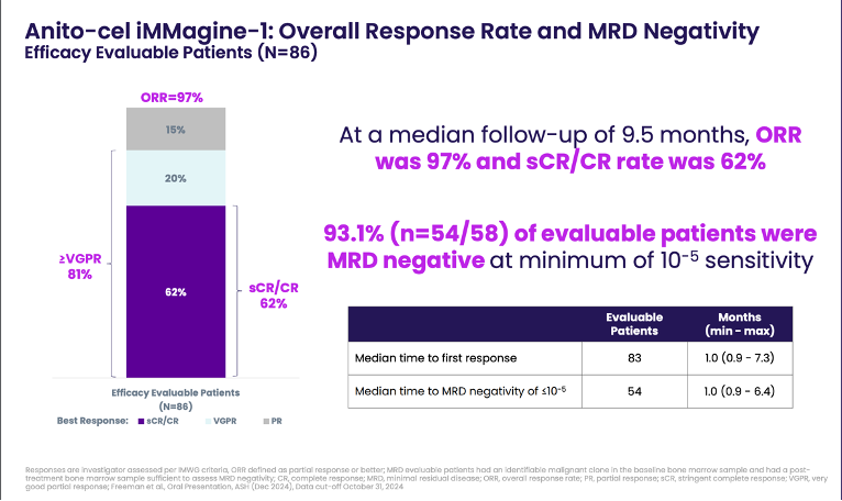 Arcellx presented Phase 2 pivotal iMMagine-1 data for anito-cel, their BCMA-targeted CAR-T for 5L+ relapsed/refractory multiple myeloma (RRMM), at ASH 2024. This was long anticipated data, as P1 anito-cel data (which was also updated at ASH) painted the picture of a real contender to market leader CARVYKTI (cilta-cel) marketed by J&J and Legend, which is already approved in the 5L+ setting, and as of earlier this year also in the much broader 2L+ setting.