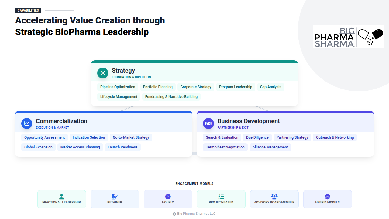 My consulting practice is structured around three core pillars: Strategy & Direction (pipeline optimization, portfolio planning, corporate strategy, program leadership, gap analysis, lifecycle management, and fundraising narratives), Commercialization & Market Execution (opportunity assessment, indication selection, go-to-market strategy, global expansion, market access planning, and launch readiness), and Business Development & Partnerships (search & evaluation, due diligence, partnering strategy, outreach & networking, term sheet negotiation, and alliance management).