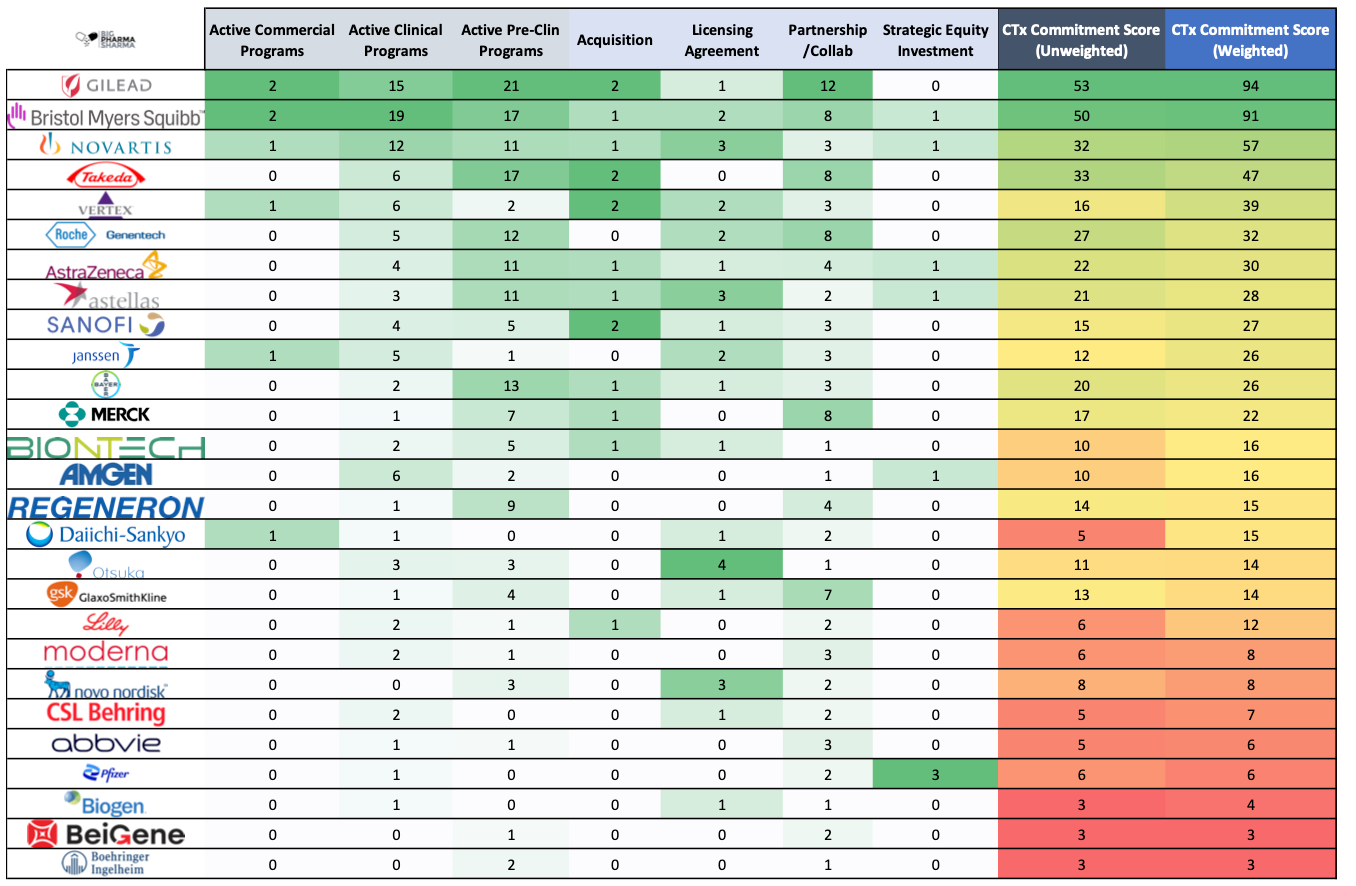 In the chart you can see both weighted and unweighted versions of the Cell Therapy Commitment Score (labeled “CTx Commitment Score” weighted and unweighted in the last 4 columns). The unweighted score is simply the raw number of programs/deals in each category summed together providing you with a sense of how active that company has been in cell therapy. The weighted score, I believe, provides a slightly more accurate picture of Cell Tx Commitment across the comparative set, by attributing more “points” to activity that signal deeper commitment levels. For example, companies with commercialized cell therapy products are clearly committed to cell therapy being a core part of the company’s strategy, while a company that simply makes an equity investment in a cell therapy company could be interested in the space from a growth standpoint, but much more easily exit that investment if the winds turn and strategic priorities change.