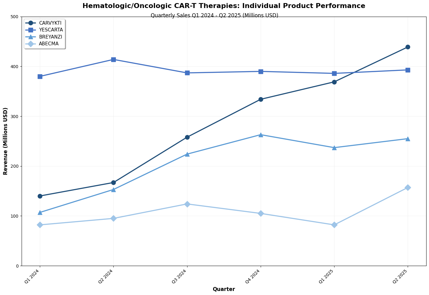 Despite this status, for much of the CAR-T class (all but CARVYKTI) sales have begun to flatline recently. The reasons for this are multi-faceted. Competition from the non-cell therapy class has eroded CAR-T market share, especially from the growth of the bispecific class, which offer strong (albeit likely not curative) efficacy, safety, and immediate treatment potential and a more site of care, making this class better suited for community hospitals where a significant amount of the heme/onc market exists. Additionally, incremental advances and novel cell therapy approvals that could have continued to advance the scientific frontier have slowed. Cell therapy has effectively ceded market share to competitive classes in oncology and/or pivoted to other diseases (e.g. autoimmune diseases) and other approaches such as in vivo CAR T.
