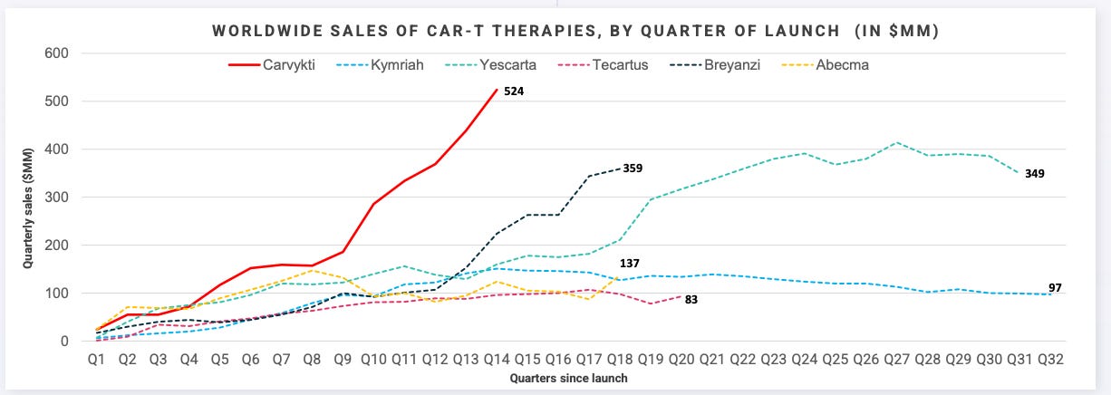 But what gets under-appreciated about bringing an entirely new therapeutic modality to market is the blocking and tackling required to commercialize and achieve the requisite scale. It is fair to say that these two initial products struggled right out of the gate with complicated deliveries, manufacturing failures, slow academic center training and approval. Ultimately, they did not meet revenue expectations in the early years of the commercialization. Over time the CAR-T market grew meaningfully as new BCMA targeting CAR-Ts came on line and the forerunning CD19 CAR-T class expanded into earlier lines of therapy, leading to Kite/Gilead’s YESCARTA and Legend/J&J’s CARVYKTI becoming blockbuster products with annual sales >$1B.