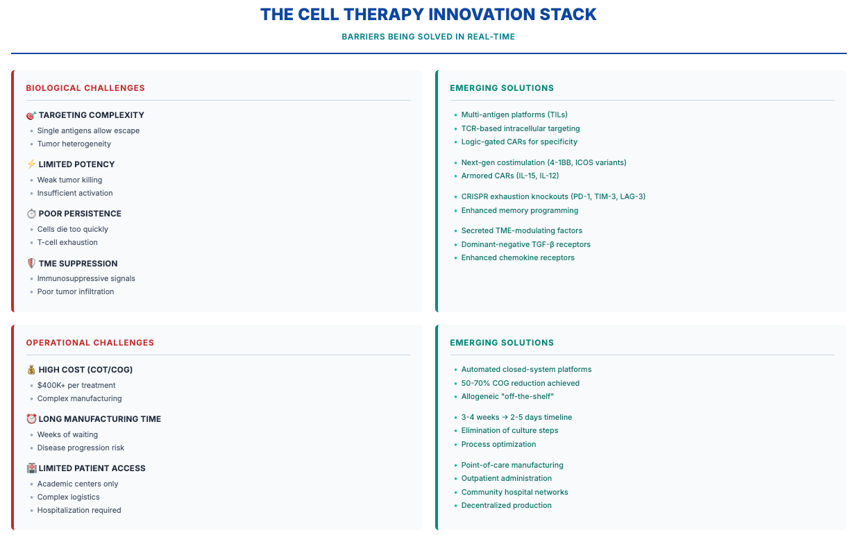 The biological challenges—targeting complexity, limited potency, poor persistence, TME suppression—are yielding to innovative engineering approaches emerging from labs and entering clinical validation. Multi-antigen platforms, intracellular targeting, enhanced co-stimulation, and TME resistance modules are no longer theoretical; they’re generating clinical data.