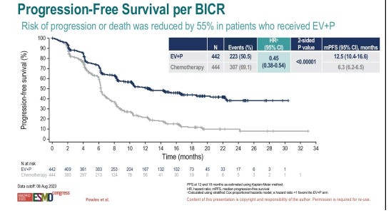 Anytime you see hazard ratios below 0.50 (i.e. a >50% risk reduction) in Oncology are hard to come by and it seems Pfizer/Seagen and Astellas hit a homerun with these data. Recall, this combination has accelerated approval for patients with frontline bladder cancer who are cisplatin-ineligible and will likely serve as confirmatory approval for this indication plus expand use of this combo into cisplatin-eligible patients in the 1L setting as well. This will go a long way towards Pfizer’s ROI on its massive buyout of Seagen (still yet to be closed), and also puts distance between Pfizer/Seagen and BMS, whose Opdivo + chemo combination in 1L cisplatin eligible bladder cancer only generated mPFS and mOS of 28% and 22%, respectively.