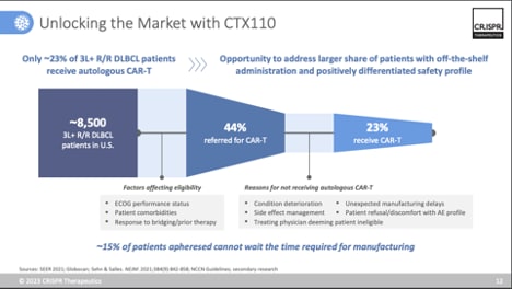 While company spin notes that CTX110 and CTX130 were “proof of concept” programs, the reality is that CRISPR would have opted to further develop these programs in pivotal studies, if they felt they had a competitive profile. In their Q1’23 investor presentation they include a slide on “unlocking the market with CTX110” (see image above), so clearly, they had commercial aspirations for this product. But when faced with data that didn’t meet the competitive bar ( e.g. 6-month CR rates in the 19-23% range) set by autologous CAR-T, it wasn’t worth further investing. And look, overall, that is a good thing. It isn’t worth investing in programs that aren’t going to be competitive. Especially for cell therapy development, being able to test in the clinic and pivot quickly to next-generation programs that offer the shot at a better product profile is vital. It’s a smart move by CRISPR, and unlike other allo’ companies, they are uniquely positioned to scuttle two lead programs in favor of 2nd-generation programs that offer a brighter day. Why is it easier for them to do this? Well, first off, they are extremely well capitalized (~$1.74B as of Q3’23), which is unlike most biotech companies right now. And secondly, they (along with their partner Vertex) are on the verge of a landmark US approval for CASGEVY (exa-cel, PDUFA December 8th, 2023), a potential curative treatment for sickle cell disease and other hemoglobinopathies. CASGEVY is projected to be a breakthrough blockbuster, with CRISPR therapeutics set to record 40% of profits on CASGEVY sales. Having lots of capital means you also have a lot of time, and CRISPR is well positioned to take its time entering the allo’ space once it feels it has a best-in-class product offering.