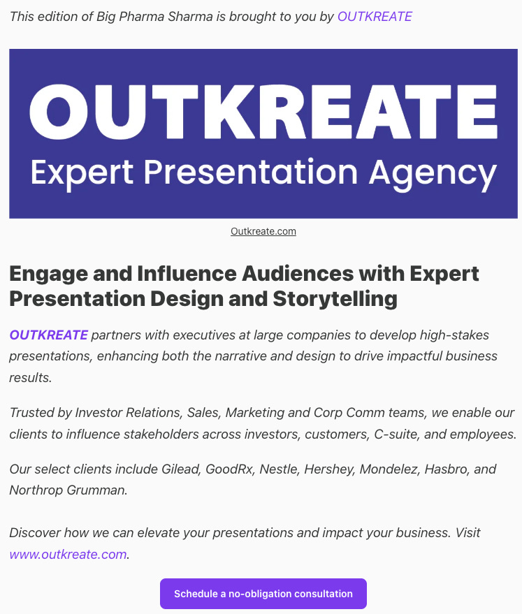 If you’re interested in exploring the opportunity of sponsoring a future post, please leave email me at shivu@bigpharmasharma.com.