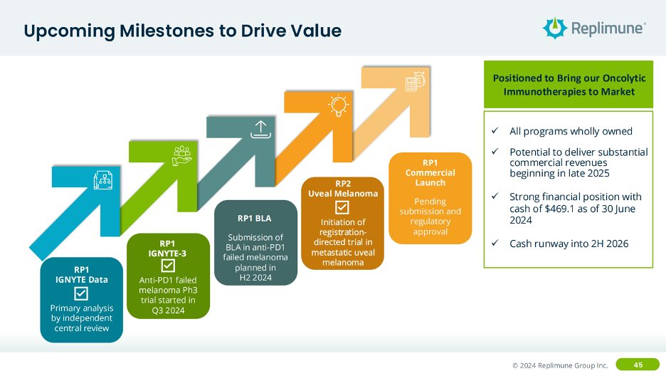 The next step for RP1, per their post-ESMO investor call, is to initiate the confirmatory Phase 3 study this quarter and file the RP1 BLA in 2L+ melanoma by the end of the year.