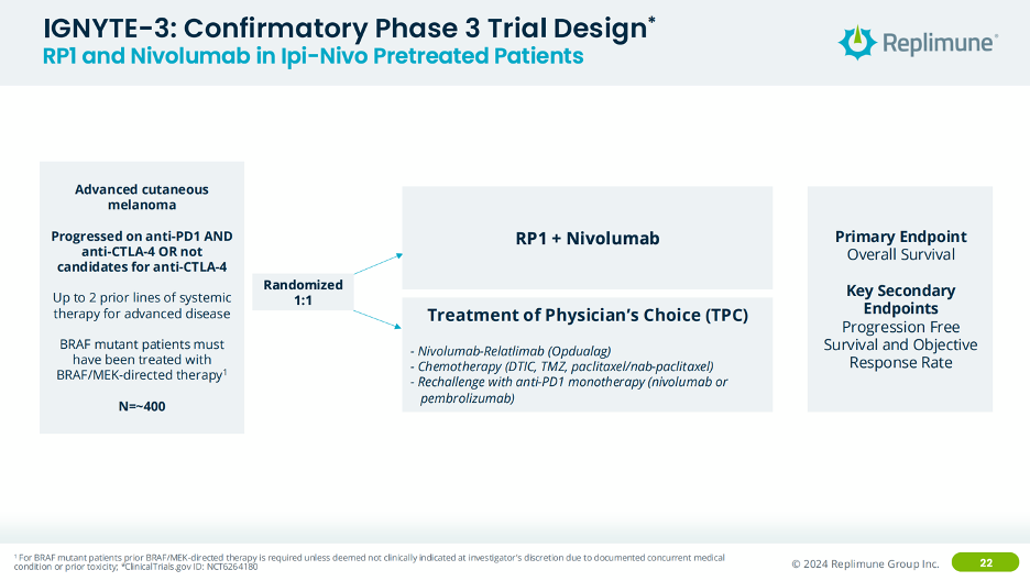 Interestingly, for RP1’s confirmatory study, they are going after the same 2L indication but in patients who have experience both nivolumab and ipilimumab (CTLA-4 mAb) or those who aren’t candidates for ipilimumab, randomized versus physicians’ choice of standard of care. From a product strategy perspective, I’m not sure that really increases your eligible patient population all that much, given that the use of PD-1 + CTLA-4 is likely decreasing as OPDUALAG (PD-1 + LAG-3) increases over time. The logical option would have been to study RP1 in 1L melanoma, however perhaps this patient population section was a stipulation from the FDA that Replimune couldn’t get around.