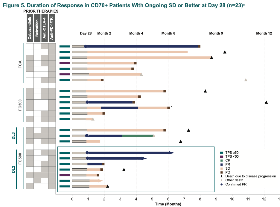 At SITC 2024, the Phase 1 TRAVERSE study of ALLO-316 in CD70-positive metastatic RCC presented an intriguing mix of promise and caution. This study targeted a highly selected population—RCC patients who had failed prior PD-1 and TKI therapies, all of whom had CD70 expression. Importantly, responses were observed only in patients with a TPS (Tumor Proportion Score) of 50 or higher, emphasizing a clear antigen expression threshold for efficacy.