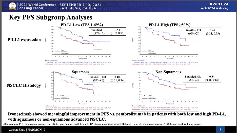Ivo demonstrated a mPFS of 11.14 months vs. 5.82 months in pembro arm, amounting to 49% risk reduction after a median follow-up of 8.67 months. More interesting were the PFS curves split out by key subgroups, where the risk reduction remained relatively consistent, albeit with slight improvements in the PD-L1 high and Squamous sub-populations.