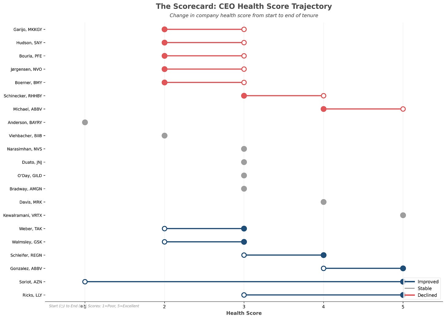 Notably, most CEOs remained relatively stable in terms of their QHS scores. You had a range of cases here. Some cases like Bayer, which started off at a QHA score of 1 in overall pretty poor health and continued to stay there. Bayer, as we know, was saddled with a significant amount of debt following the Monsanto acquisition and was also tied up in a legal battle with several class action lawsuits related to Roundup. They had a declining pharma business and have struggled to generate growth, remaining “down in the dumps” while awaiting a turnaround.